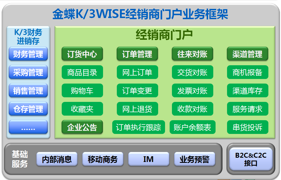 金蝶經(jīng)銷商管理解決方案 經(jīng)銷商管理系統(tǒng)主要以K/3WISE經(jīng)銷商門戶模塊為主,介紹經(jīng)銷商如何通過經(jīng)銷商門戶進行溝通、訂貨、退貨、對賬等,形成金蝶K/3WISE經(jīng)銷商門戶解決方案。 適用企業(yè) 具有完整的經(jīng)銷商網(wǎng)絡(luò),希望提高經(jīng)銷商綜合管理水平,完善經(jīng)銷商業(yè)務的企業(yè) 企業(yè)特征 經(jīng)銷商訂貨量大,希望通過更快捷的方式下訂單 經(jīng)銷商希望能實時了解訂單狀態(tài) 經(jīng)銷商希望了解企業(yè)庫存,以免出現(xiàn)下單無貨的情況 供求雙方對賬業(yè)務繁雜,希望能方便快捷的處理對賬 企業(yè)希望能有效分析管理經(jīng)銷商庫存 適用行業(yè) 電子、機械、家電、五金等制造行業(yè)均可